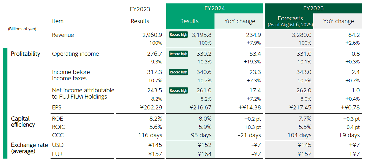 In fiscal 2024, revenue increased 7.9% year on year to ¥3,195.8 billion, surpassing ¥3 trillion for the first time. Operating income rose 19.3% to ¥330.2 billion, income before income taxes increased 7.3% to ¥340.6 billion and net income attributable to FUJIFILM Holdings grew 7.2% to ¥261.0 billion. Revenue marked a record high for the third consecutive year, operating income for the fourth consecutive year and net income attributable to FUJIFILM Holdings for the fifth consecutive year. In the Healthcare segment, revenue exceeded ¥1 trillion for the first time, driven by the strong performance of the Medical Systems business, which saw steady growth in endoscopes and medical IT, as well as the Bio CDMO business, which expanded contract manufacturing of antibody drugs at its large-scale production facility in Denmark. Other performance drivers were the Semiconductor Materials business, which benefited from growing demand for advanced semiconductors for generative AI and from a semiconductor process chemicals business acquired in fiscal 2023, as well as the Imaging segment, which saw strong sales of instax instant photo systems and digital cameras.