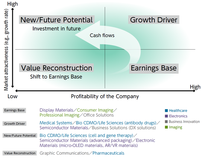 At the core of these initiatives is our robust business portfolio. We have a unique portfolio that combines New/Future Potential and Growth Driver businesses―represented by our robust investments in segments with growing markets, such as Healthcare and Electronics―with strong Earnings Base businesses (cash cows), including the Business Innovation segment and Imaging segment, which support these growth investments. Under VISION2030, we will continue reviewing our business portfolio while assessing market attractiveness and profitability. To this end, we will focus on business renewal and transformation with the goal of achieving an operating margin of 10% or higher across all businesses.