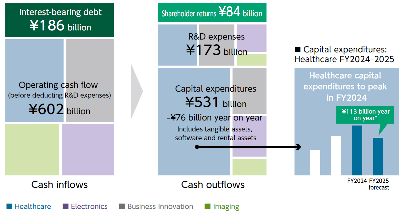 Our plan under VISION2030 is to invest a total of ¥1.9 trillion in growth investments (combined R&D expenses and capital expenditures) from fiscal 2024 through fiscal 2026, exceeding the level under VISION2023. Of this total, ¥1.6 trillion is to be allocated to the New/Future Potential and Growth Driver businesses. In the first year, fiscal 2024, we made capital investments exceeding ¥600 billion, primarily in the Healthcare and Electronics segments. In fiscal 2025, we plan to allocate ¥531.0 billion in cash to capital expenditures and ¥84.0 billion to shareholder returns. Capital expenditures in the Healthcare segment, which peaked in fiscal 2024, are projected to decline ¥113.0 billion year on year in fiscal 2025.