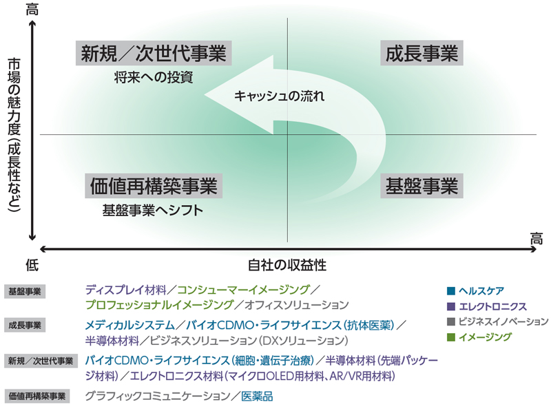 これらの取り組みの基盤となるのが、当社の強固な事業ポートフォリオと言えます。市場が拡大するヘルスケアセグメントやエレクトロニクスセグメントなどの確固たる投資先(新規/次世代事業、成長事業)を持ち、同時にそれらへの投資を支える、ビジネスイノベーションセグメントやイメージングセグメントといった強い基盤事業(キャッシュカウ)を併せ持つという、当社ならではの事業ポートフォリオの強みです。VISION2030では、市場の魅力度と収益性を見極めながら事業ポートフォリオの検証を続け、全事業で営業利益率10%以上とする目標に向けた事業の新陳代謝と変革に注力しています。