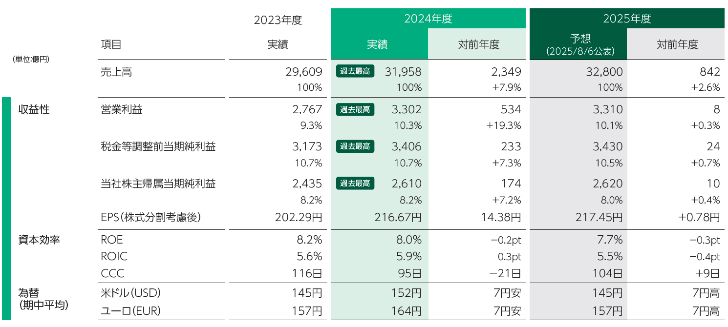 2025年度も、引き続きヘルスケアセグメントやエレクトロニクスセグメントの成長をさらに加速させるとともに全事業の収益力向上に努めていきます。外部環境として、米国の関税政策への対応も重要な課題ですが、サプライチェーンの見直し、経費の追加削減などの適切な対策をタイムリーに講じることで、事業への影響を最小限に抑えていきます。それにより、関税によるマイナス影響を織り込みながらも、売上高は前年度比2.6%増の3兆2,800億円、営業利益は同0.3%増の3,310億円、税金等調整前当期純利益は同0.7%増の3,430億円、当社株主帰属当期純利益は同0.4%増の2,620億円と、それぞれ過去最高業績を更新する見通しです。