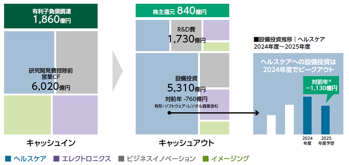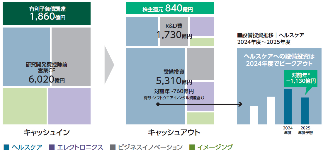 VISION2030において、2024年度から2026年度までの成長投資(研究開発費・設備投資額の合計)はVISION2023を上回る1.9兆円を計画しています。そのうち1.6兆円を「新規/次世代」「成長」事業に振り向ける計画であり、初年度の2024年度はヘルスケアセグメント・エレクトロニクスセグメントを中心に合計6,000億円超の設備投資を実行しました。今年度はキャッシュ使途として、設備投資に5,310億円、株主還元に840億円を計画しています。ヘルスケアセグメントへの設備投資は2024年度にピークアウトし、今年度は対前年で1,130億円減の予定です。
